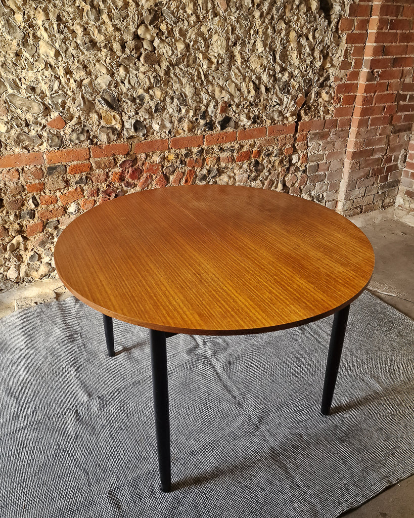 This dining table and chairs has a post modern vibe and would look stunning in any style of interior from mid century to modern rustic. Comprising of a teak table with ebonised legs made by G Plan in the 1960s it is in good condition and is extendable to seat either four or six people comfortably. It is accompanied by four Danish post modern ebonised chairs which have been fully restored and upholstered to match beautifully with the set. This would make a stunning addition to any home. We are selling this as a set and price includes all four chairs and table. This Mid Century Teak Dining Table & Chairs set will look stunning in any home. Sophisticated and timeless, it features post modern designs and 1960s craftsmanship. Create a truly special dining experience with the extendable table, designed to seat four or six people comfortably. Fully-restored and upholstered chairs designed with post modern style will ensure that this set is an eye-catching addition to your home - a lasting reminder of the beauty of mid century design.