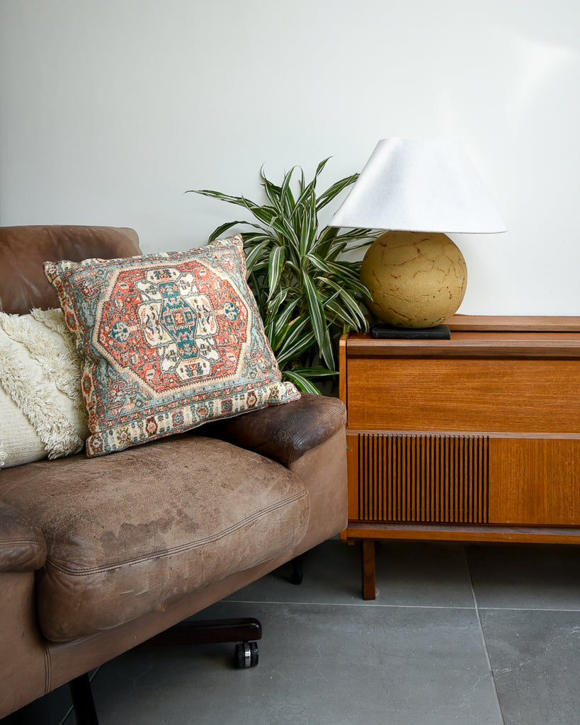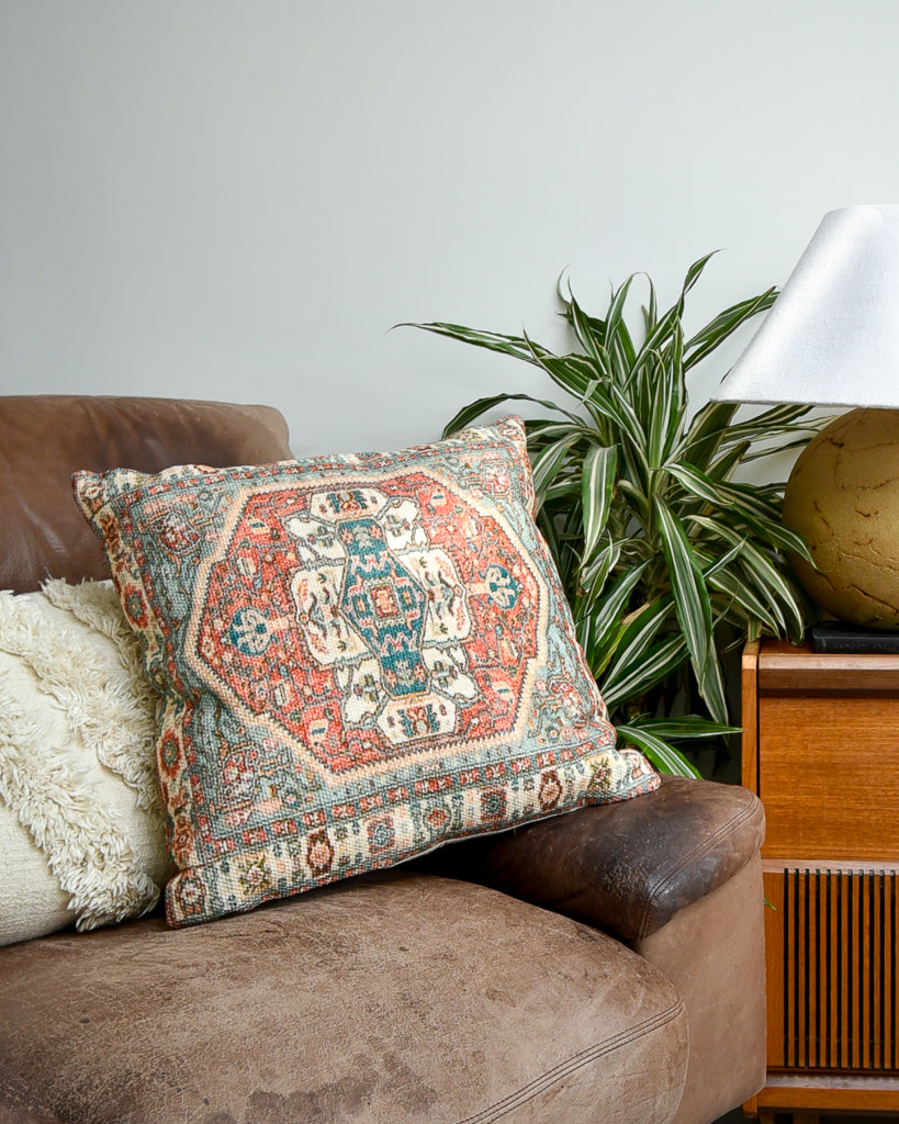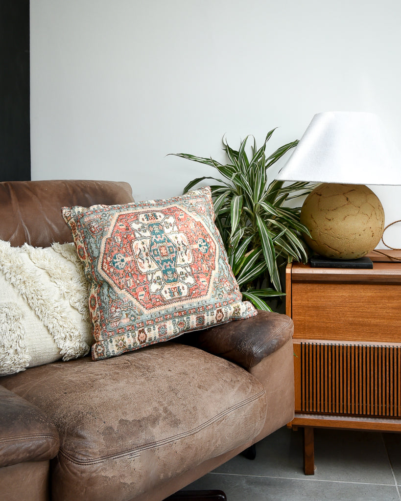 This elegant Moroccan / Turkish vintage-style cushion is crafted from soft cotton, adding a sophisticated touch to any room. It includes a hypoallergenic polyester inner, with an option to upgrade to a duck feather filling. The removable cover is washable, combining practicality with style. Featuring a beautiful printed effect tapestry with a blend of creams, aqua, terracotta and green/blue hues, this cushion offers both comfort and visual appeal. Its versatile design complements traditional, mid-century, and contemporary décor, making it a distinctive addition to your home. Please note, these cushions are new and sourced from the stock of a business that has unfortunately ceased trading - they are a lovely quality, well made and soft.